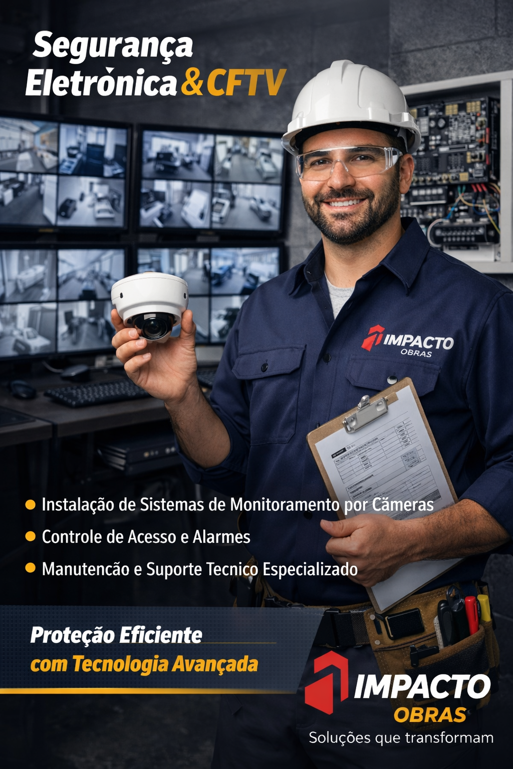 A Impacto Obras oferece soluções completas em Segurança Eletrônica e Sistemas de CFTV, projetadas para garantir proteção, monitoramento contínuo e controle total dos ambientes, atendendo às necessidades de clientes comerciais, industriais, corporativos e residenciais.
