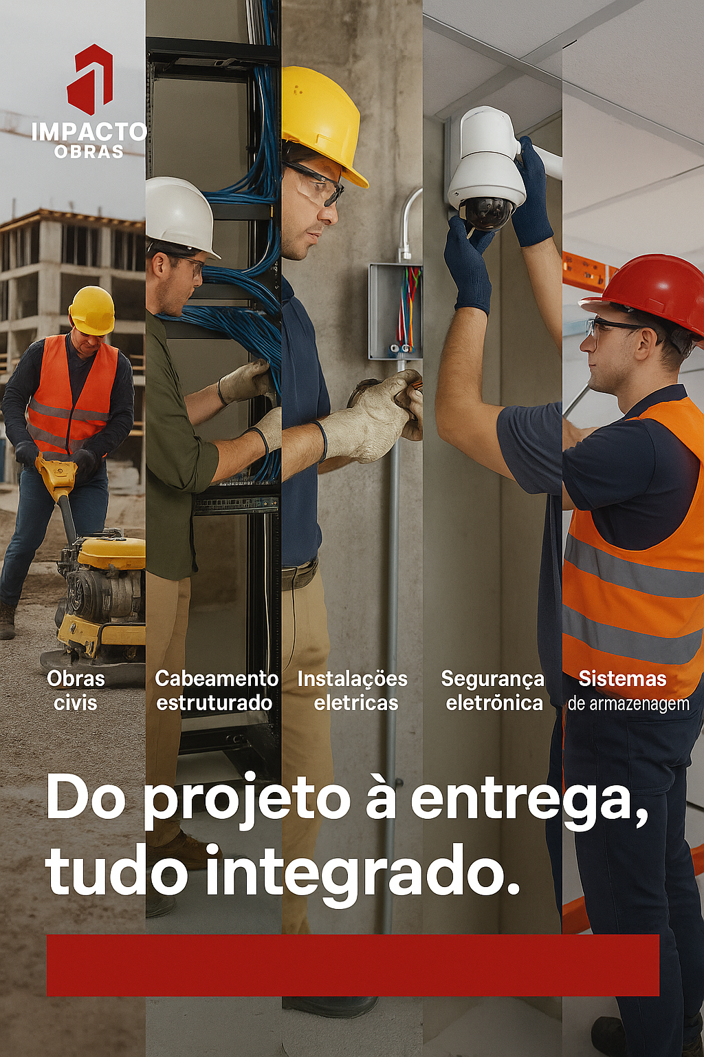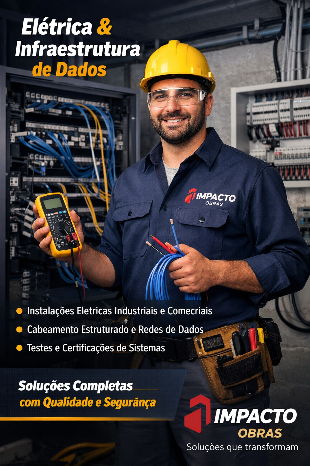 Na Impacto Obras, contamos com uma equipe técnica altamente qualificada para execução de serviços elétricos e infraestrutura de dados, garantindo segurança, eficiência e conformidade com as normas técnicas vigentes.